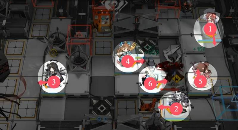 如下图所示,开局按顺序布置 ①桃金娘(下)、②山(左)、③塑心(左)、④纯艾(右)、⑤艾雅法拉(上)、⑥逻各斯(右),其中桃金娘技能好了就开,山的状态准备好了就切换过来。之后摆完挂机即可。