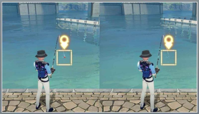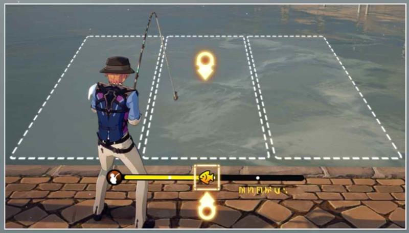 水面分为左中右三个区域,开拓者需根据鱼所在的位置调整鱼竿到相同方向进行钓鱼。当鱼竿方向和鱼的位置相同且未收竿时,可降低鱼线张力,反之鱼线张力会增加。