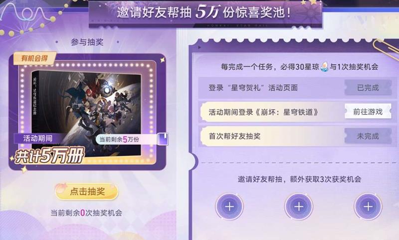 最后是“好友互助”阶段,从4月9日3.2版本更新后开始,持续到5月10日23:59。在这个阶段,开拓者们可以通过完成任务以及邀请好友帮抽,获取最多5次抽奖机会,抽取5万份纪念册。同时,开拓者们还可以通过这个阶段的活动获取最多星琼90个。这个阶段的活动不仅增加了获取纪念册的机会,还为开拓者们提供了额外的星琼奖励,让福利更加丰富。