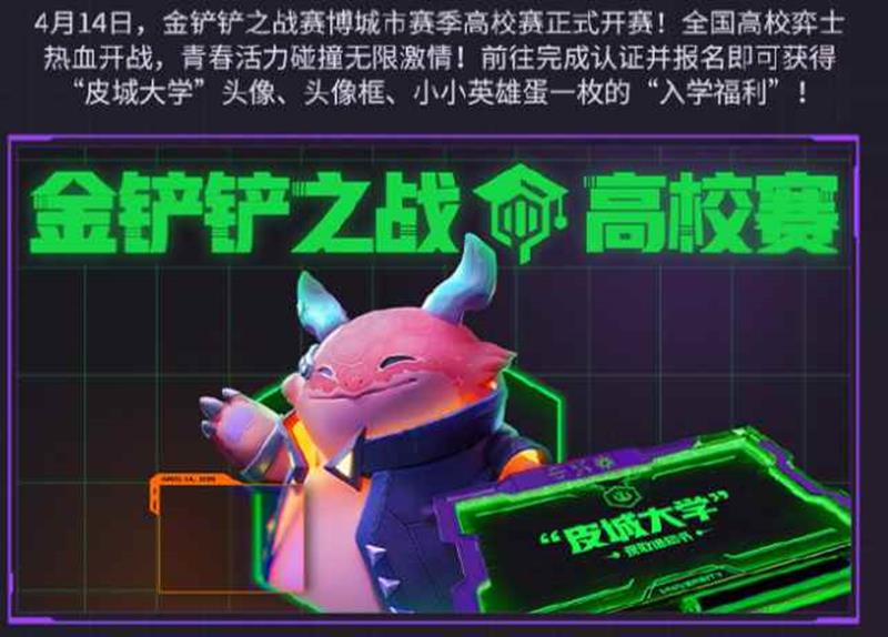 4月14日,金铲铲之战赛博城市赛季高校赛正式开赛!全国高校士热血开战,青春活力碰撞无限激情!前往完成认证并报名即可获得皮城大学”头像、头像框、小小英雄蛋一枚的“入学福利”!