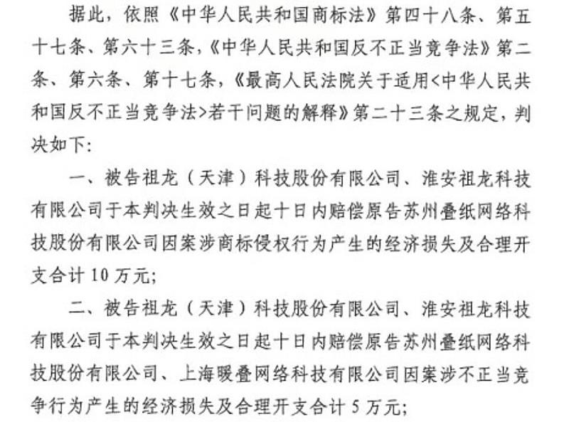最终,法院判决祖龙赔偿叠纸商标侵权损失及合理开支共计10万元,同时赔偿不正当竞争损失5万元。叠纸游戏在回应中表示,将持续重点打击此类侵权行为,维护健康有序的行业生态与公平竞争的市场环境。