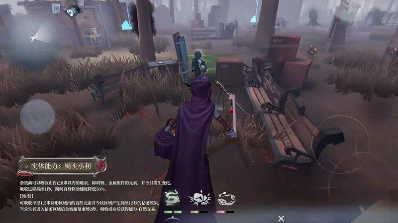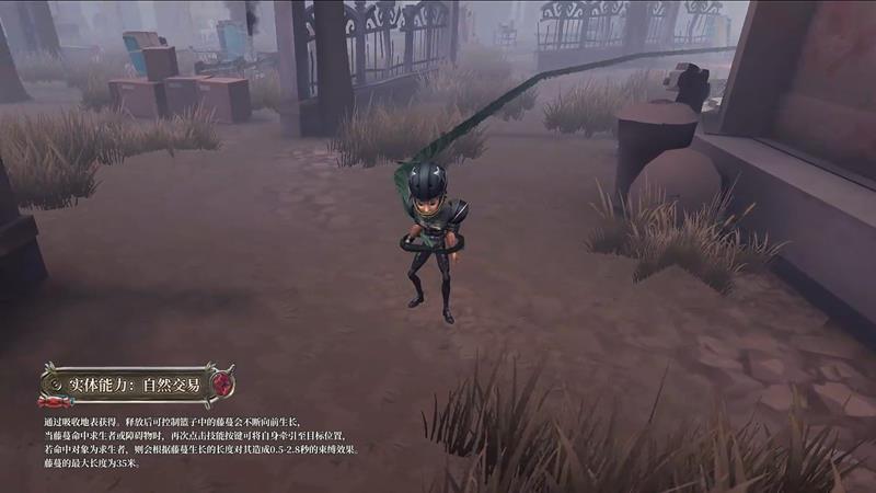 可吸收半径1.5米圆形区域内的自然元素并令该区域产生持续12秒的枯萎效果,当求生者进入枯萎区域后会被藤蔓束缚2秒。吸收成功后获得能力-自然交易。