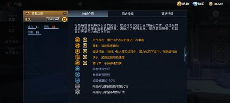 在技能方面王者之刺除去英雄级近战武器标配的快手与急行军之外,王者之刺拥有三项专属技能:灵气攻击、背刺以及破绽打击。