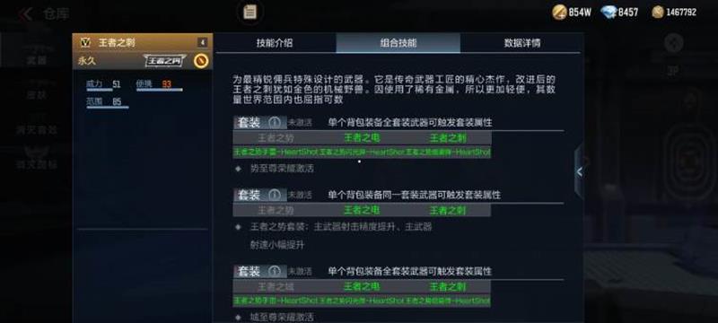 同时王者之刺还可以与其他武器组成套装,如王者之势套装、王者之城套装和王者之神套装。王者之势套装和王者之城套装可以提升主武器射击精度与射速,王者之神套装则可以增加主弹匣子弹数。