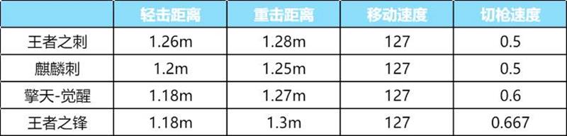 在数据方面,王者之刺的轻击距离为1.26米,堪称近战武器中的巅峰存在,不仅高于麒麟刺、擎天觉醒、王者之锋一系列英雄级近战武器。而王者之刺的重击距离为1.28米,其数据同样高于绝大多数英雄级武器,可以说仅次于王者之锋的1.3米。并且在切枪速度方面,王者之刺也可以说是领先的存在。