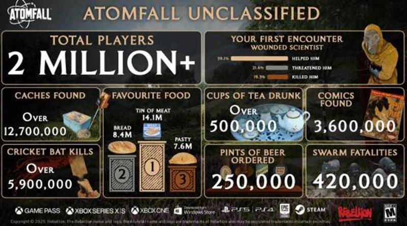 由Rebellion开发的末世冒险游戏《原子陨落》迎来强劲开局,官方宣布:游戏在发售首月玩家数量突破200万。日前,游戏官方还揭晓了一组游戏数据: