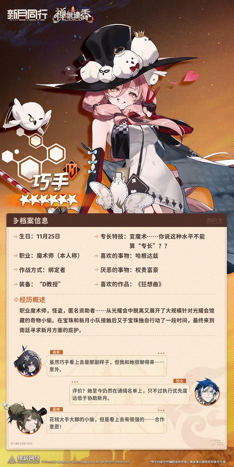 新月同行官方发布了新角色【巧手】的技能预览,很多玩家想要了解新月同行的巧手有哪些技能,下面我们一起来看一下新月同行巧手的最新技能一览。