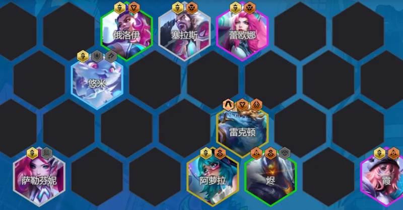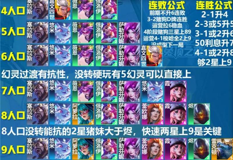 阵容搭配:幻灵战队的核心阵容包括萨勒芬妮、塞拉斯、俄洛伊、薇恩、悠米、蕾欧娜、阿萝拉等。在7人口时,可以搭配2重装战士(如蕾欧娜、塞拉斯)来提升前排坦度。8人口时,可以考虑加入烬或盖伦来进一步提升输出和控制能力。