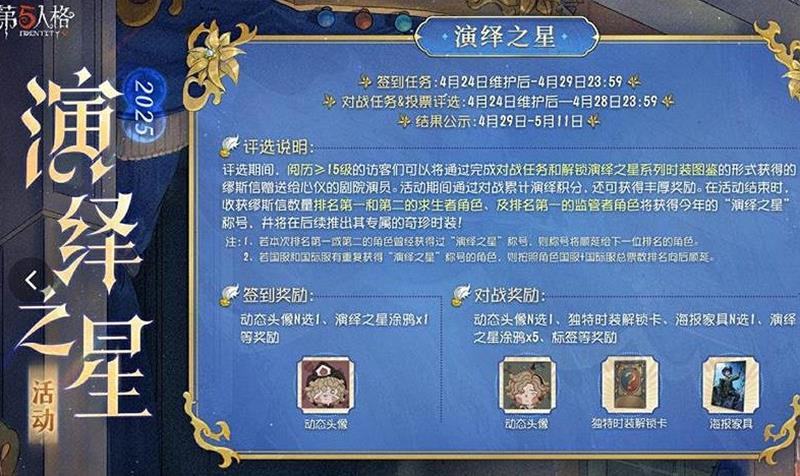 活动将于2025年4月20日正式启动,持续至5月10日,为期21天。在这期间,参与者可以通过参与对战、完成任务等方式累积演绎之星积分,并争夺排名奖励。每场比赛结束后,系统会根据表现自动发放相应的积分。此外,完成每日任务和活动挑战还能获得额外的积分加成。求生者和监管者们需要密切关注游戏内的活动公告,了解最新的任务内容和积分规则,以便更好地参与活动。