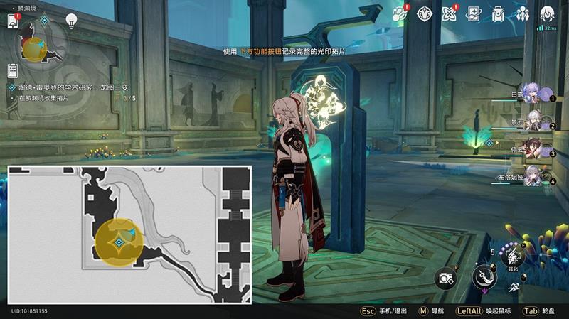 鳞渊境的拓片分布在不同位置,按照顺时针方向依次收集,分别在北部、柱子下方、南边角落、机关后面以及柱子后面拍照获取。
