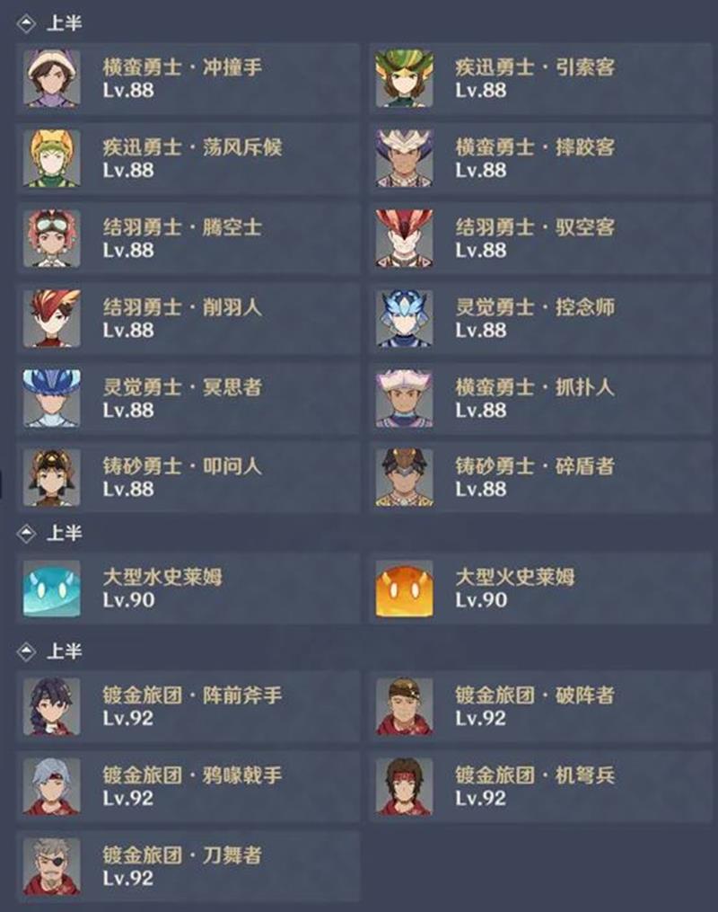 11-1为经典守塔关,共4波人形怪,每波6只,共24个怪物。11-2共8波怪物,每波两只水史莱姆和两只火史莱姆,共32个怪物,注意水火免疫,建议不要带纯水火的角色。11-3共10波怪物,每波6个镀金旅团杂兵,共60个怪物,怪物数量较多,温迪聚怪的优势得以体现。本期上半最佳阵容是莫甘温,第四人可随意搭配,如加入万叶补充温迪技能空窗期的聚怪。