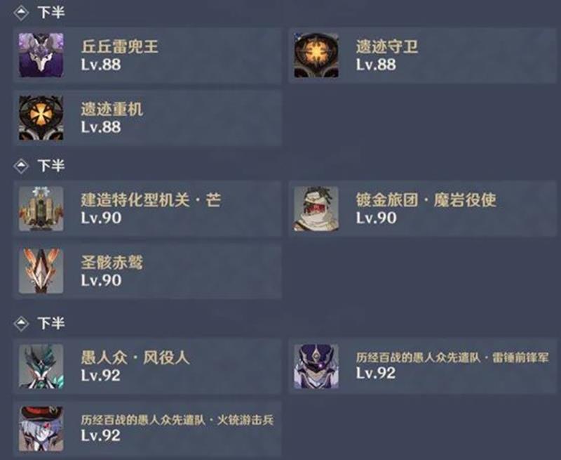 下半怪物阵容相对复杂,11-1共三波怪物,第一波雷丘丘王,第二波遗迹重机,第三波遗迹守卫。11-2共三波怪物,第一波枫丹挖掘机,第二波镀金旅团召唤师,第三波火圣骸兽,召唤师优先打其召唤物,圣骸兽单走难度降低,注意规避伤害。11-3第一波为愚人众风役人,会给我方角色上生命之契,部分攻击会对附加了生命之契的角色造成更高伤害,且有冻结抵抗,永冻队需时刻补水。第二波为两个地方传奇愚人众,推荐先杀火枪,雷锤亡语易导致减员。下半队伍推荐带一水一冰方便破盾。