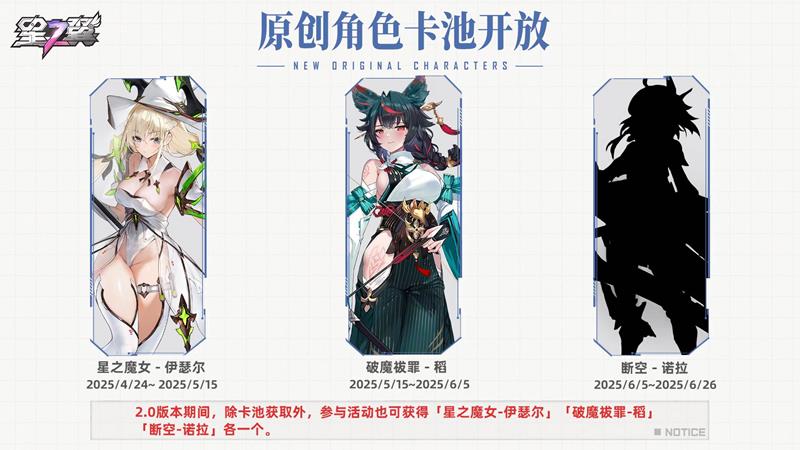 4.17日,游戏将同步开启2.0版本庆典【星启盛典】,陆续上线三位原创新角色,参与活动即可领取「星之魔女-伊瑟尔」「破魔祓罪-稻」「断空-诺拉」各一个,角色炫彩皮肤也将同步上架。同时赛事系统全新开启,团长们可报名参与线上举办的各类赛事获取专属赛事奖励,还可通过观战系统观看大神录像与好友录像欣赏精彩操作。