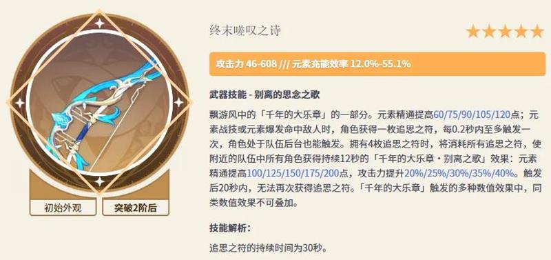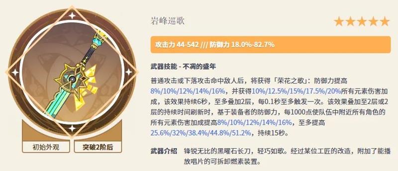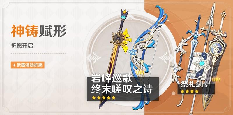 本期卡池的五星武器为岩峰巡歌和终末嗟叹之诗。岩峰巡歌是希诺宁的专武,能提供大量防御加成和队伍增伤效果。不过,希诺宁本身0命实力已经很强,无需专武也能发挥不错的作用。终末嗟叹之诗是辅助向温迪的专武,能提供高额充能和元素精通,泛用性很好,但考虑到其他辅助弓箭角色也有替代品,终末的抽取优先级也不算特别高。