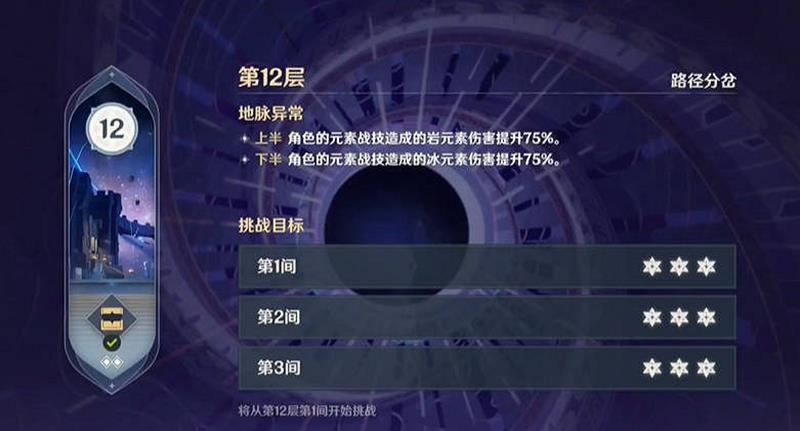 在原神5.5版本新深渊12层中,上半角色的元素战技造成的岩元素伤害提升75%,下半角色的元素战技造成的冰元素伤害提升75%。第一间上半为水形幻人,下半为深渊咏者·紫电、千年珍珠骏麟。第二间上半为秘源机兵·构型械,下半为压制特化型机关·芒、熔岩游像·流燃体、雳震·大灵显化身。第三间上半为幻形豕兽·水、历经百战的浊水喷吐幻灵、历经百战的浊水粉碎幻灵,下半为玄文兽、深海龙蜥·原种、圣骸角鳄。这些配置对旅行者的队伍搭配和元素反应运用提出了较高要求。