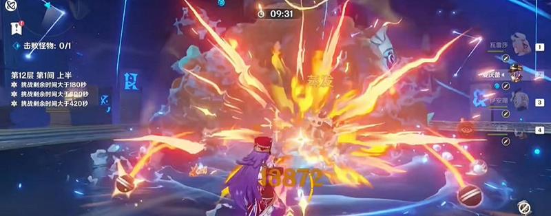 在12-1上半,开局瓦雷莎平A挂雷,夏沃蕾释放Q技能,伊安珊使用EAQ连招,夏沃蕾再接长E,随后切香菱吃球并开启大招丢锅巴。接着瓦雷莎进入EAAEAAQ的循环输出,注意闪避水人的砸地和圈技能,伤害较高。夏沃蕾有Q技能时可以破掉小水人,或者由伊安珊使用EAQ来破盾。夏沃蕾长E后,香菱继续开大丢锅巴。如果怪物血量不多,可将香菱大招留到下一间,或者控制输出节奏,确保下一间有香菱大招可用。