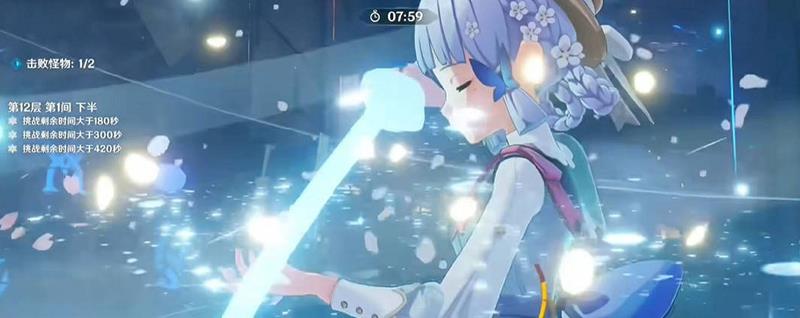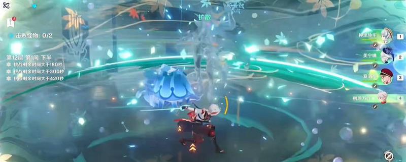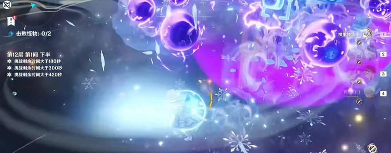 12-1下半,芙芙先释放EQ,夏洛蒂接Q,切绫华吃讨龙遁地,万叶减抗,绫华开大并使用E接重击。进入锁血阶段后,万叶开大染冰,再充能后夏洛蒂释放E,切绫华继续输出。注意远离并闪避怪物释放的球,避免受到高额伤害。第二只怪物出现后,绫华染冰,万叶充能并开大染冰,再切绫华破盾。盾条剩一半左右时,切水神释放EQ,夏洛蒂Q,绫华E接A重破盾。破盾后染冰,万叶减抗,绫华直接开大。如果输出不足,进入Boss飞天机制时,可使用能与雷系反应的元素破掉3个球。