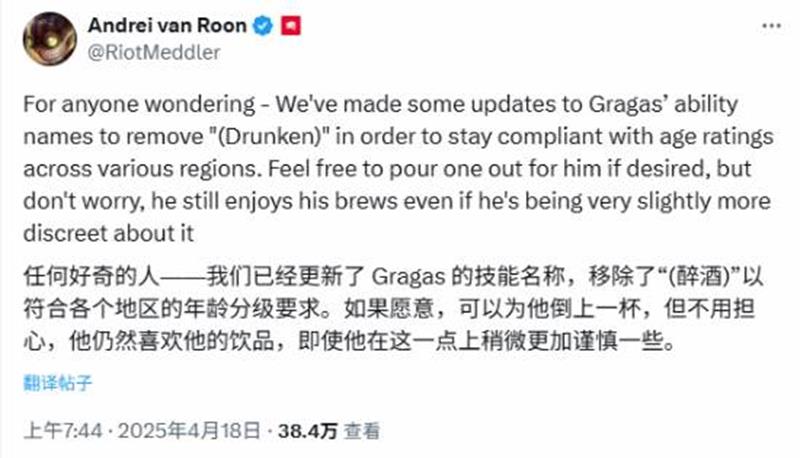 Andrei van Roon表示:“致各位好奇的玩家,为了应对不同地区的年龄分级,我们将酒桶·古拉加斯的技能名称进行了更新,移除了‘醉酒’字样。若各位想为他举杯致敬请随意,不过请放心,这位酒桶大师依然热爱他的佳酿,只是现在稍微低调了那么一点点。”
