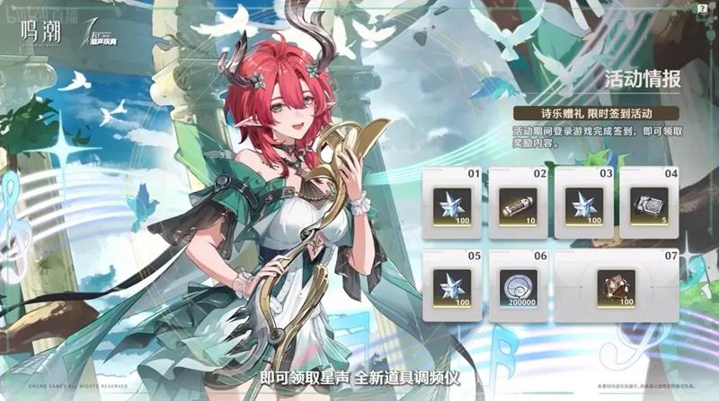 除了卡池安排,本次周年庆还有诸多福利。版本开启后,首充双倍重置,漂泊者可以通过活动获取飞行器皮肤,同时在团子活动中还有漂泊者的主页皮肤可以领取。此外,官方还增加了“诗乐赠礼”限时签到活动,漂泊者通过签到可以获得300星声以及一些游戏道具奖励。5月23日周年庆当天,登录游戏后,漂泊者可获得10个金球以及一个专属头像。在周年庆期间,完成任务获取积分,还可以兑换游戏资源奖励。