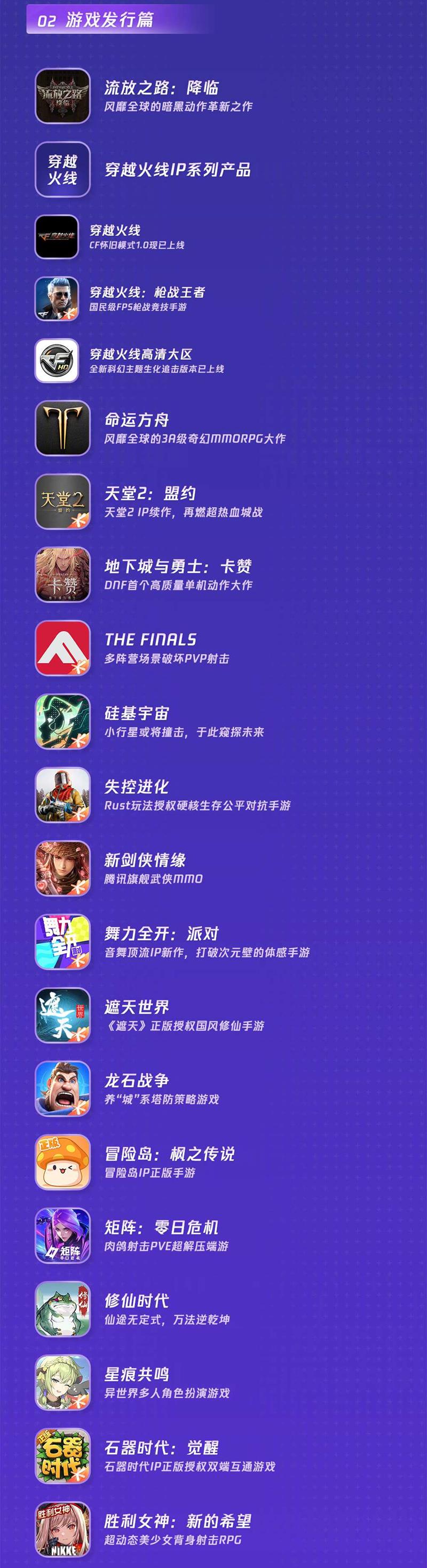 游戏发行篇章亮点不断,流放之路:降临以暗黑动作革新之作姿态登场。穿越火线IP系列产品全面更新,穿越火线怀旧模式1.0现已上线,穿越火线:枪战王者定位国民级FPS枪战竞技手游,穿越火线高清大区推出全新科幻主题生化追击版本。命运方舟作为3A级奇幻MMORPG大作,天堂2:盟约延续经典IP热血城战,地下城与勇士:卡赞成为DNF首个高质量单机动作大作。THE FINALS带来多阵营场景破坏PVP射击体验,硅基宇宙探索未来科技,失控进化获得Rust玩法授权打造硬核生存手游,新剑侠情缘作为腾讯旗舰武侠MMO,舞力全开:派对以音舞IP新作打破次元壁,遮天世界获得《遮天》正版授权打造国风修仙手游,龙石战争聚焦城系塔防策略玩法。