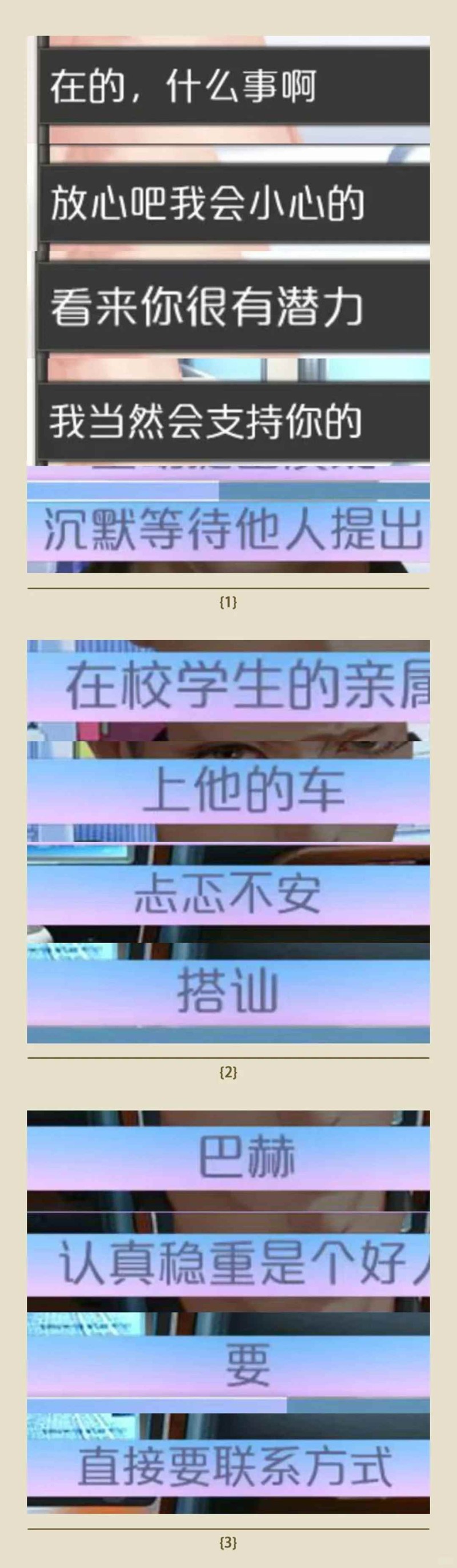 在的什么事情—放心吧我会小心的—看起来你很有潜力—我当然会支持你的—沉默等待他人提出—在校学生的亲属—上他的车—忐忑不安—搭讪—巴赫—认真稳重是个好人—要—直接要联系方式