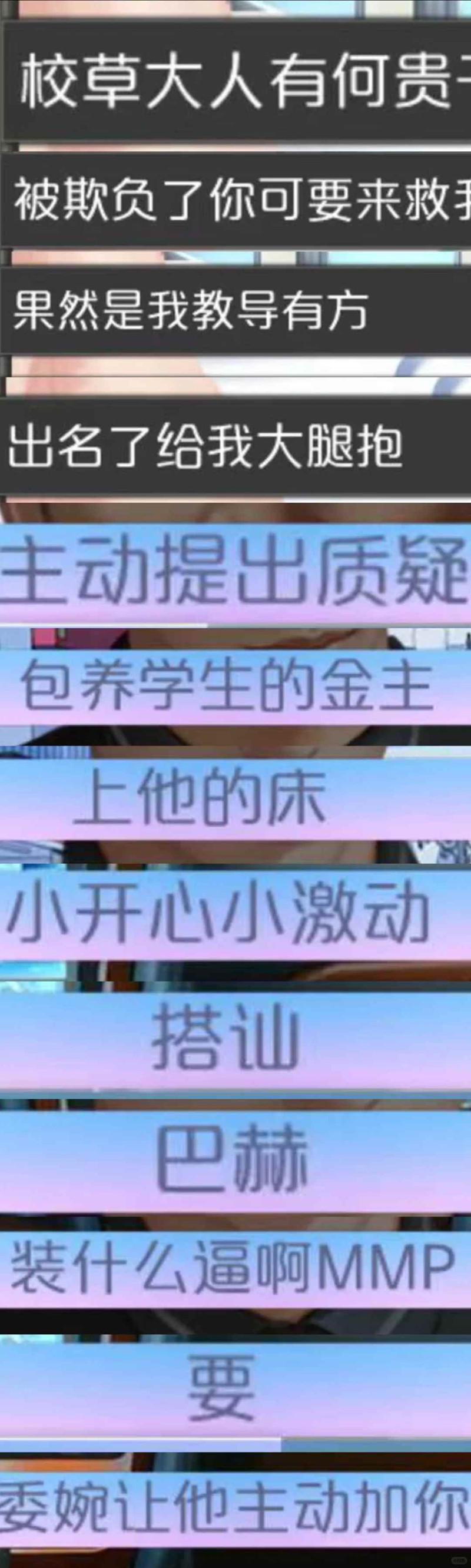 校草大人有何贵干—被欺负了你可要来救我—果然是我教导有方—出名了给我大腿抱—主动提出质疑—包养学生的金主—上她的床—小开心小激动—搭讪—巴赫—装什么逼呀MMP—要—委婉让她主动加你