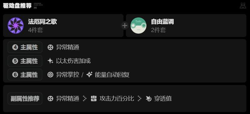 在驱动盘方面,推荐使用法厄同之歌四件套,它能提供较高的异常精通属性,还能补充缺少的以太增伤区。二件套则可选择自由蓝调或混沌爵士,进一步提升异常精通面板,最大化核心技的收益。音擎方面,飞鸟星梦是首选,双生泣星也是不错的锻造音擎,满精的触电唇彩也可以考虑佩戴。