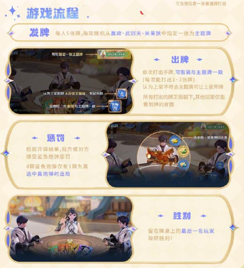 发牌每人5张牌,每轮随机从赢政、武则天、米莱狄中指定一张为主题牌