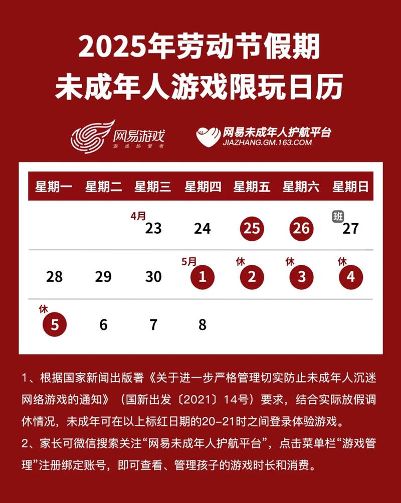 2025年五一限玩日历已经发布,未成年人五一假期能玩游戏的时间已经明确。以上就是2025年五一限玩日历的相关内容。如果这篇攻略对你有帮助,还请点个收藏关注一下切游网,各位读者的支持就是我们持续更新的最大动力。
