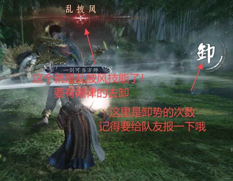 开局承伤a一下,然后就不用打了,也不用卸势,奶妈回血就行(一定要奶妈的)。等boss提示追风击后,先不用起跳,被追风击打到的第一下,三段跳就行,这样就可以卡掉风场了(风场就是被追风击打到产生的小旋风哦)。然后大家集合等待,承伤也可以把boss拉到角落,然后大家在角落里面卸会好点。等待boss出现风吼后,就要开始准备卸势了。等boss出现乱披风字样,就要卸势了,前面boss会平A两下,不算的,只有在现乱披风字样后的才算哦,然后卸了多少次可以在队伍频道里面发次数,统计满25下就可以过了。