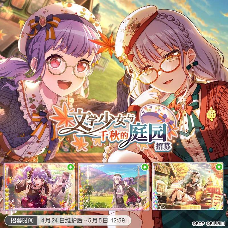 与此同时,“文学少女与千秋的庭园招募”活动也正式开启,招募时间将持续至5月5日12:59。本次招募新增了多位成员,包括★5宇田川亚子[下定决心的奔跑]、★5凑友希那[在迷途的尽头]和★4冰川纱夜[操不完的心]。BanG Dreamer们可以通过消耗星石进行招募,每次招募将累积1点招募星愿值,当累积到50点时,招募将必定出现新增招募的★5成员之一。此外,通过本招募获得的成员将附赠招募贴纸,可用于在招募贴纸交换所兑换相应成员或道具。