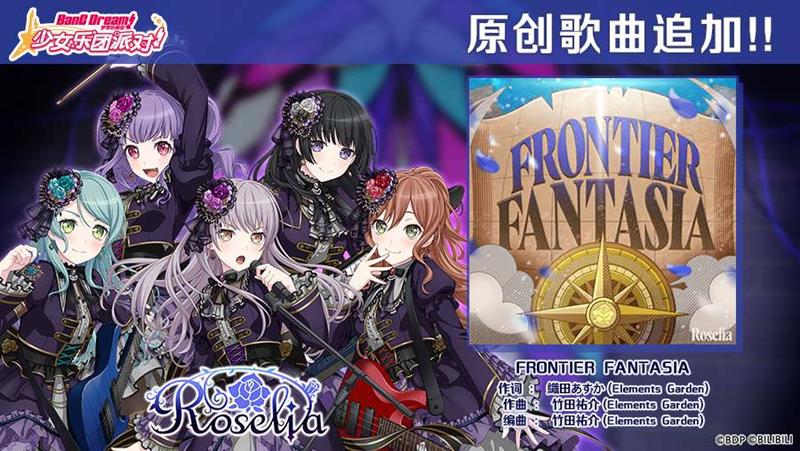 除了精彩的活动外,《BanG Dream! 少女乐团派对!》还追加了原创歌曲《FRONTIER FANTASIA》,由Roselia演唱。这首歌曲将在维护后发放至BanG Dreamer们的礼物箱中,等待大家登录游戏领取。