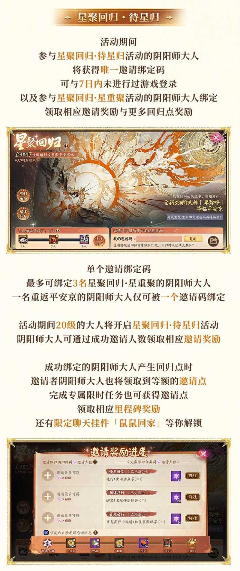 活动期间,20级的阴阳师大人将开启“星聚回归·待星归”活动。通过成功邀请人数,阴阳师大人可领取相应的邀请奖励。成功绑定的阴阳师大人产生回归点时,邀请者也将获得等额的邀请点。此外,完成专属限时任务还可获得邀请点,领取相应的里程碑奖励。限定聊天挂件「鼠鼠回家」等你解锁,为你的平安京之旅增添更多个性化的色彩。