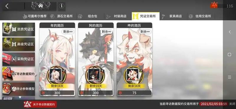 同时,每次寻访可获得一张寻访数据契约,可用于当期寻访数据契约交换所兑换指定干员。当期寻访数据契约交换所关闭后,剩余未兑换的寻访数据契约将自动兑换成六张寻访参数模型,可用于寻访参数模型交换所兑换指定物品。