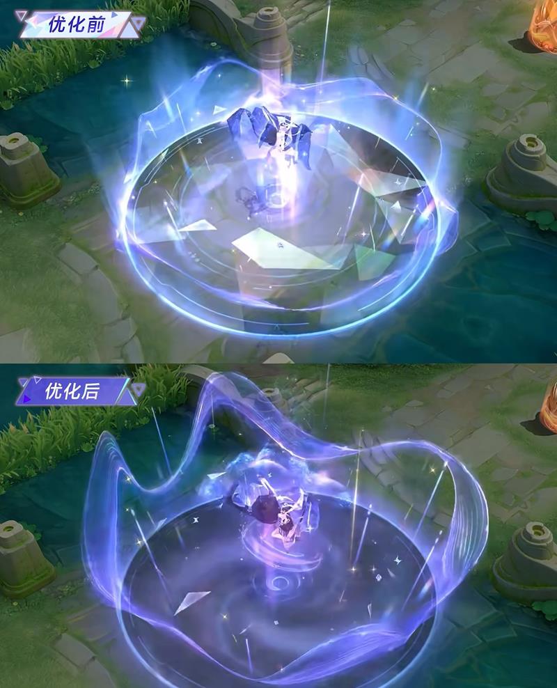 二技能的优化则体现在特效元素与光效的丰富上。宇宙之景上极光涌动,众星升起时光芒更加闪耀。这种设计不仅让玩家仿佛置身于浩瀚宇宙之中,还增强了技能的视觉冲击力。玩家在释放二技能时,能够感受到更加震撼的视觉效果,仿佛自己就是掌控宇宙的歌姬。