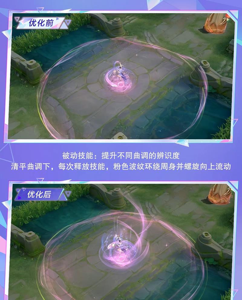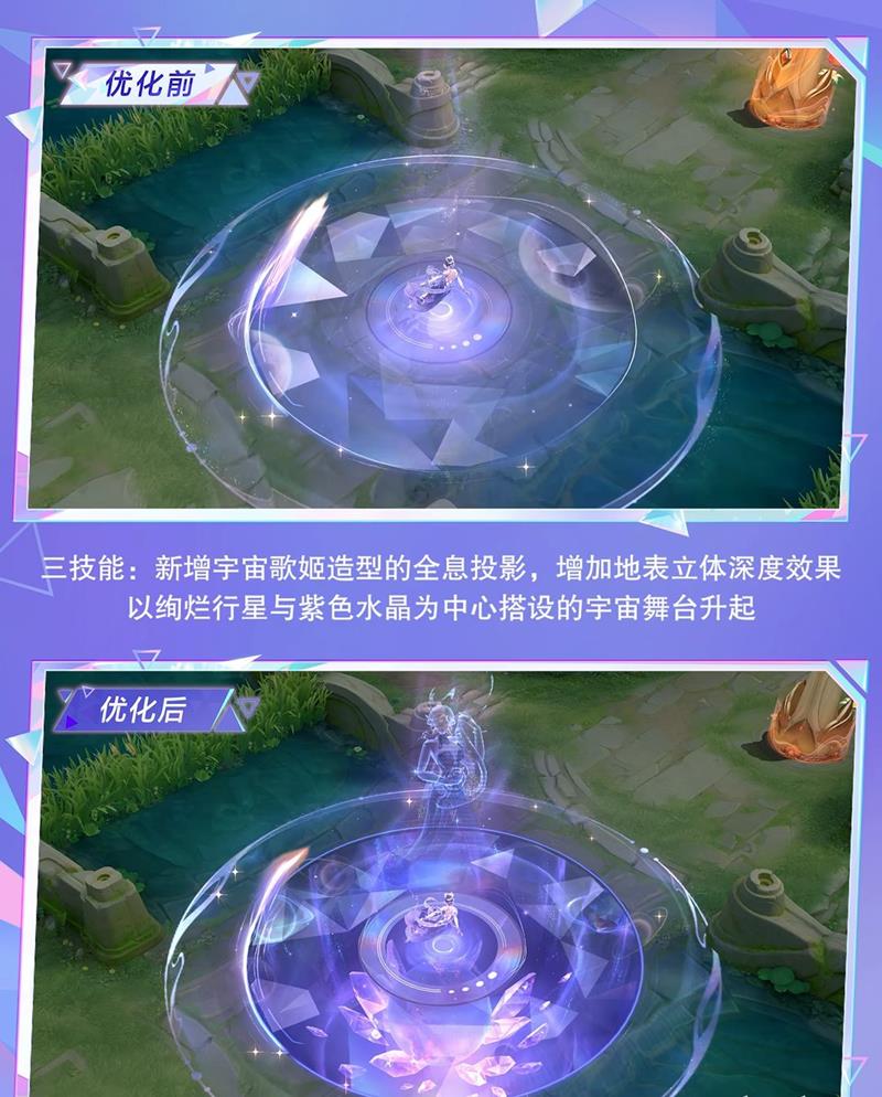 最为引人注目的优化是三技能。新增了宇宙歌姬造型的全息投影,并增加了地表立体深度效果。以绚烂行星与紫色水晶为中心搭设的宇宙舞台升起,在破阵和清平曲调下,紫色或粉色全息投影状态的歌姬会拨动琴弦。这种设计不仅让技能的视觉效果更加华丽,还为玩家带来了一种全新的游戏体验。玩家在使用三技能时,仿佛置身于一场宇宙音乐会之中,享受着视觉与听觉的双重盛宴。