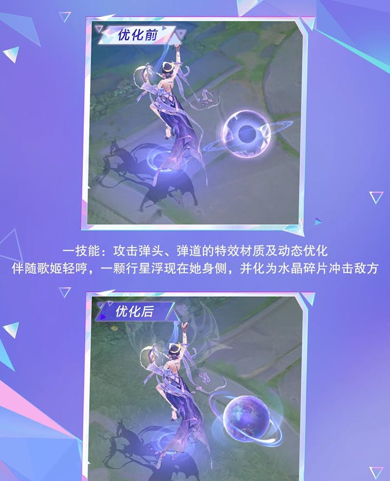 在一技能方面,攻击弹头和弹道的特效材质及动态也进行了优化。当歌姬轻哼时,一颗行星会浮现在她身侧,并化为水晶碎片冲击敌方。这种特效不仅让技能的视觉效果更加震撼,还增加了技能的趣味性和观赏性。玩家在使用一技能时,能够感受到更加流畅和华丽的视觉体验。