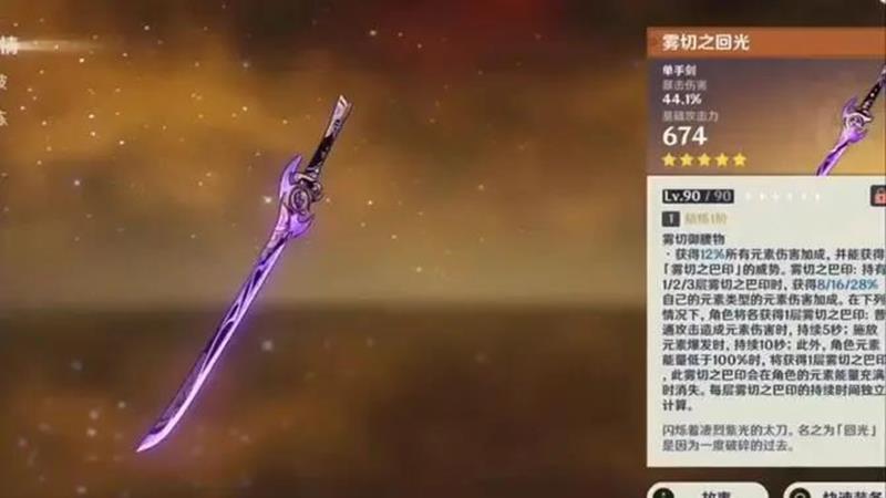 雾切之回光作为神里绫华的专武,同样适合丝柯克。它能提供暴击伤害和元素伤害加成,武器效果三层容易被丝柯克叠满,无论是普攻流派还是大招流派,丝柯克都能稳定享受到两层武器效果。