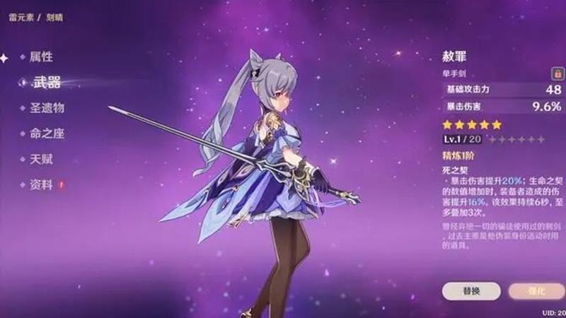 赦罪作为克洛琳德的专武,能提升角色暴击伤害,但只能吃到一半武器特效,因为生命之契效果是枫丹部分角色专属,所以这把武器对丝柯克来说效果一般。
