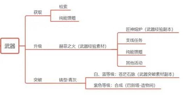 高等级武器可以通过检索或纯能馈赠30级获取,升级和突破素材的获取途径如下: