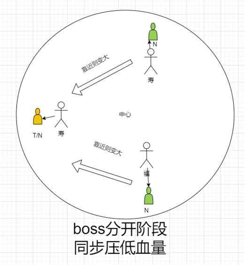 2、然后三人以场地中心为准站好三角形,全队分开打,boss血条下方有个圈,圈满了会变大(福禄)。