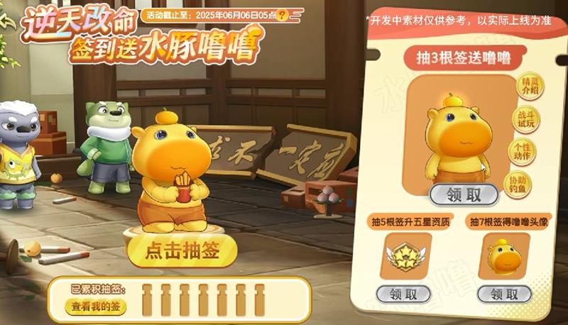 4月30日更新后至6月6日5:00期间,小西普们累计签到三天即可领取可爱的联动精灵·水豚噜噜;签到五天可将水豚噜噜直升至五星资质;签到七天可获得联动精灵纪念头像。