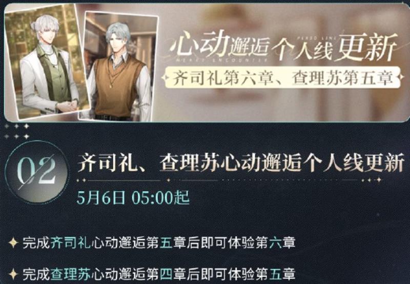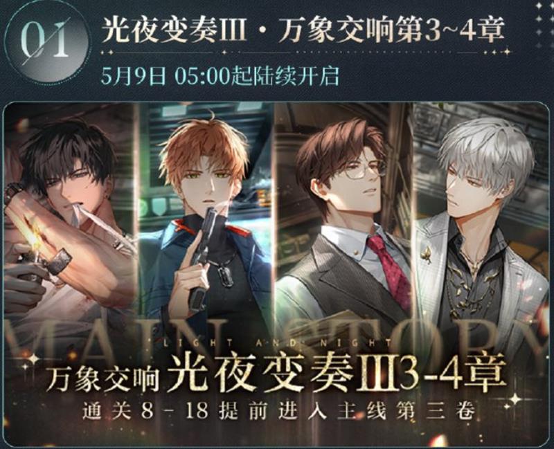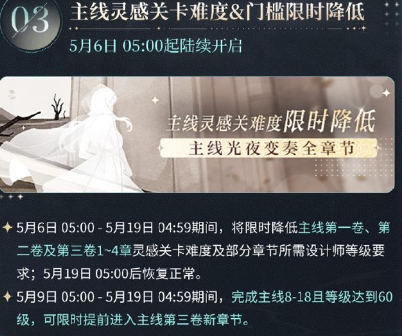 光夜变奏Ⅲ・万象交响第3~4章将在5月9日陆续开启,等级达到60级且通关主线8-18的设计师可限时提前进入。此外,齐司礼心动邂逅第六章、查理苏心动邂逅第五章也将在5月6日更新。