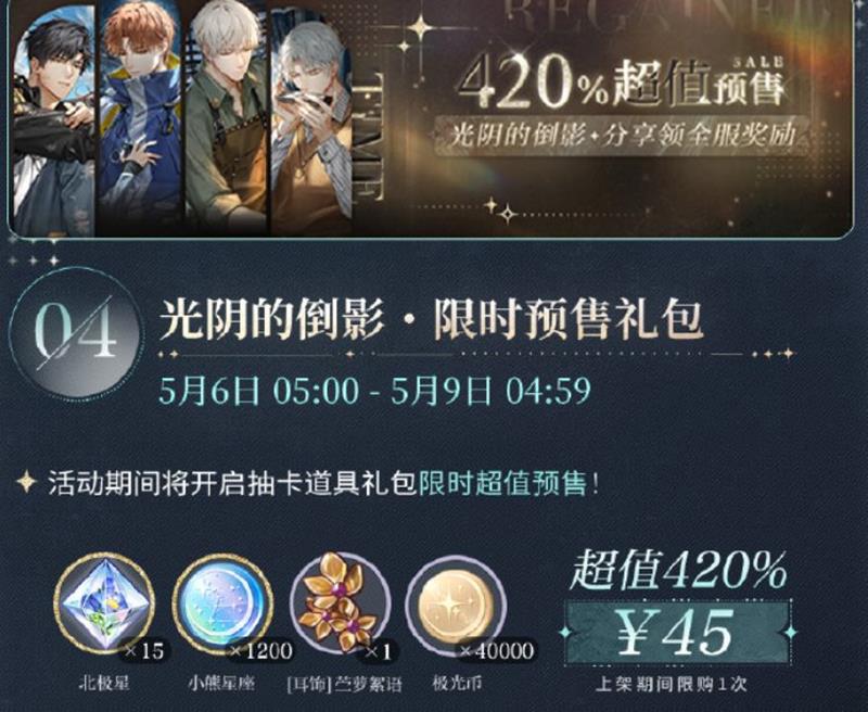 限时活动“留光叙夜Ⅱ”和“绮想馈礼”将在5月9日上线。同时,限定收信“光阴的倒影・破寐/无拘”也将开启,累计收信可获得自选五星灵犀。