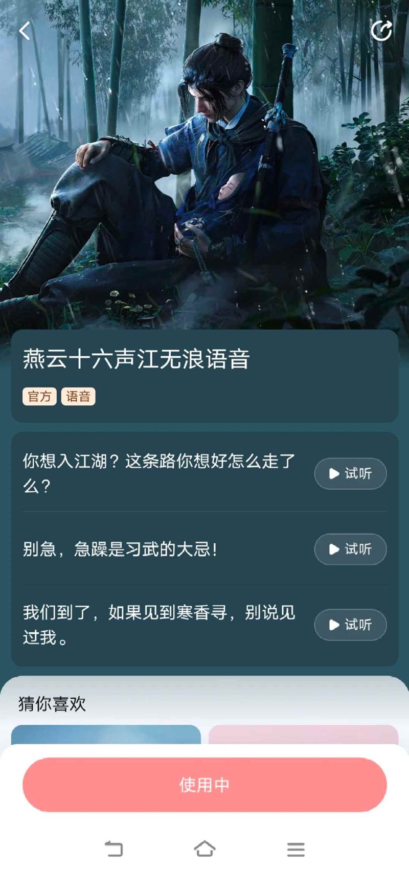燕云十六声不少玩家是被游戏“看板郎”游戏登录页面抱着少东家在雨里行走的帅气江叔吸引进游戏的,江无浪江叔在网络上拥有很高的热度,今日燕云十六声同百度地图联动上架了江叔导航语音包,一起来和小编看看吧~