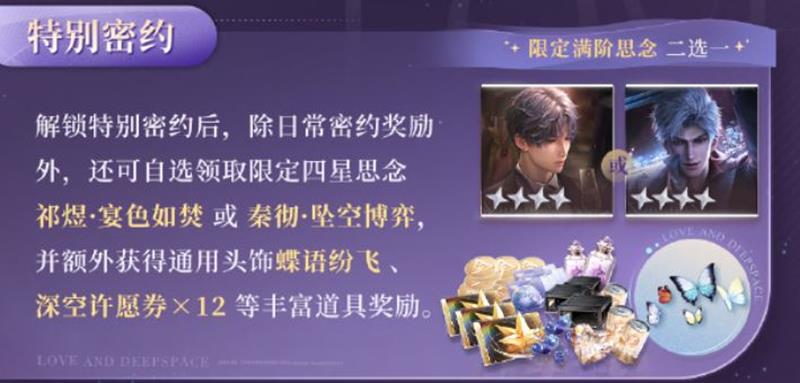 除日常奖励外,还可自选领取限定四星思念「祁煜·宴色如焚」或「秦彻·坠空博弈」,并额外获得通用头饰「蝶语纷飞」、「深空许愿券×12」等丰富道具。