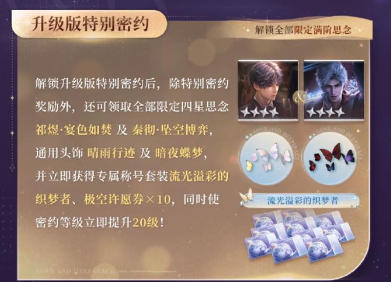 解锁后,可领取全部限定四星思念、通用头饰「晴雨行迹」及「暗夜蝶梦」,并立即获得专属称号套装「流光溢彩的织梦者」、「极空许愿券×10」,同时密约等级提升20级。
