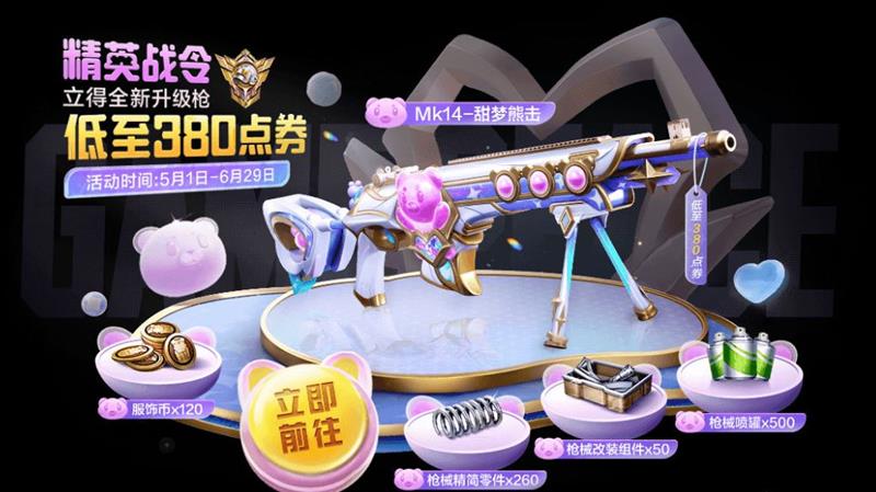 就在今天,和平精英全新精英战令曝光,本期精英战令将推出全新的5级升级枪皮Mk14-甜梦熊击。这是一款外观十分精品的皮肤外观。我们来一起看看吧!