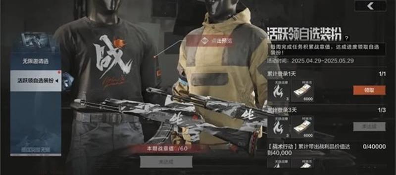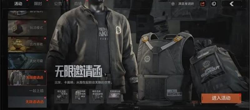 从2025年4月29日至5月29日,先锋们可以参与【无限邀请函】活动,免费获得暗区无限联动主题夹克衫、KN突击防弹衣涂装、老旧口袋背包涂装等外观奖励。同时,参与相关活动还能累计获得2个“无限装扮自选箱”,可从白狼作战服、来战·AKM、来战·AK74N、来战·上衣、300装扮券中五选一。此外,通过参与活动,先锋们还能获得最高2400装扮券、120万柯恩币以及2×3复合安全箱体验卡(3天)等丰厚奖励。