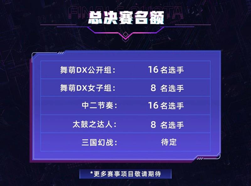 总决赛名额根据项目不同有所差异,例如舞萌DX公开组有16名选手名额,舞萌DX女子组和太鼓之达人女子组各有8名选手名额,中二节奏则有16名选手名额。至于三国幻战项目的总决赛名额尚未确定,但相信随着赛事的推进,这一信息将很快公布。